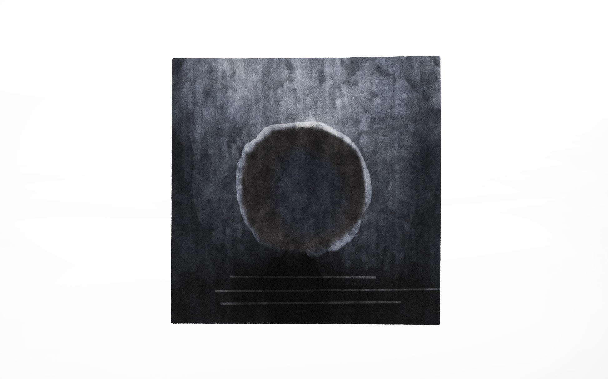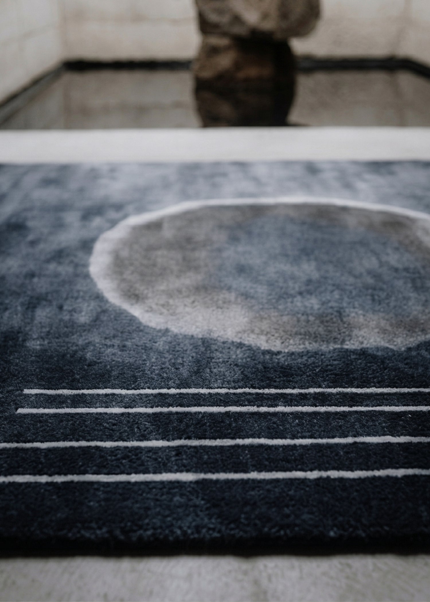 This rug does not represent a photographic eclipse on water, but rather a conceptual and metaphorical representation of one. The rug on the floor, with its abstract design, becomes an "inner sky" or a plane of existence where the astronomical event is internalized and contemplated.