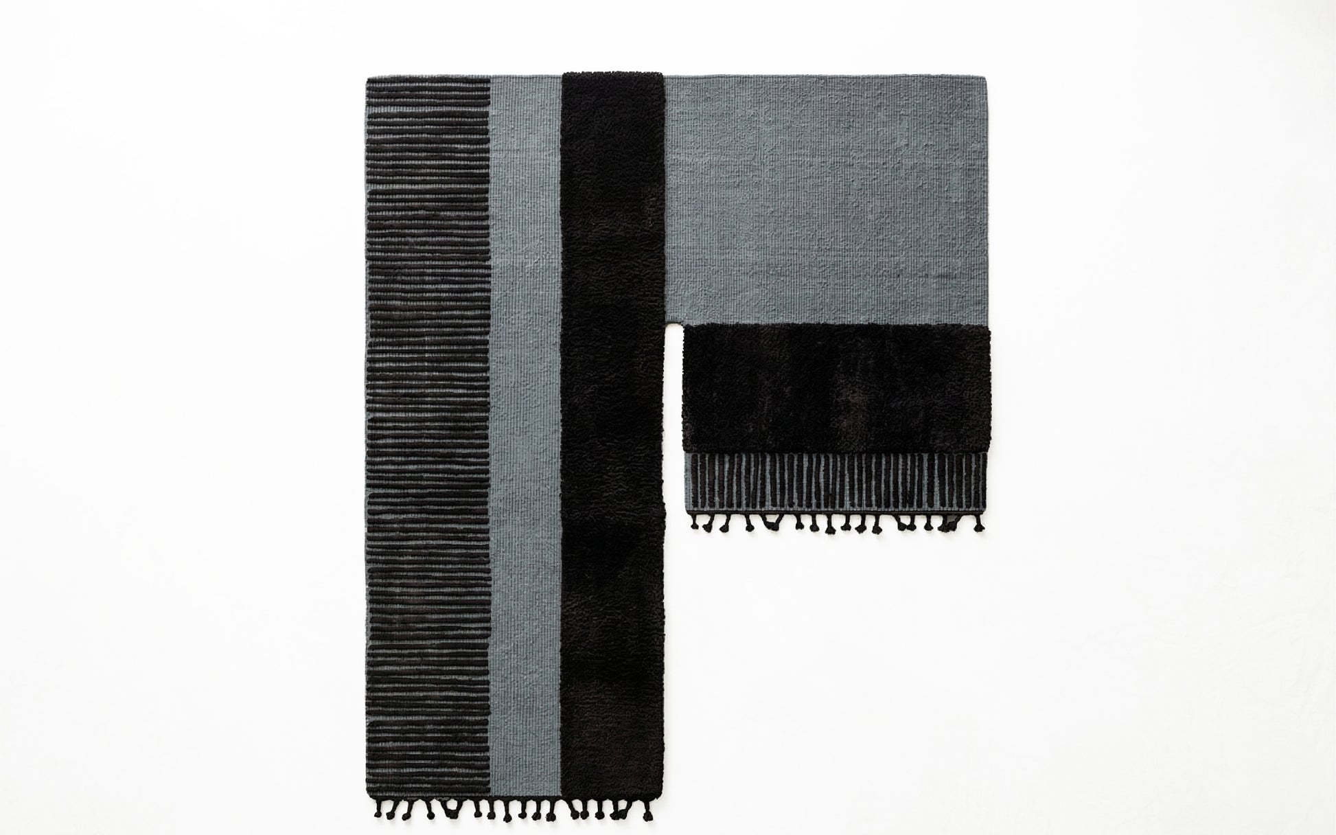 The collection features an asymmetric, multi-level construction composed of two textile blocks offset both vertically and horizontally. This modularity creates an irregular silhouette that breaks traditional geometric boundaries. The surface alternates fine horizontal ribbed textures with bold, rhythmic line patterns for visual depth. A prominent central band in high, plush pile serves as the axis of both union and separation, introducing a significant tactile and volumetric contrast against the flatter base weave. The outer edges are finished with dense, handcrafted fringes, adding a dynamic, artisanal detail to the overall architectural design.